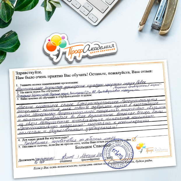 Основной плюс «Профакадемии» - это дистанционное обучение ГО и ЧС на сайте. Доступные, подробные лекции. Оперативная работа менеджера, который подробно отвечал на каждый интересующий вопрос. В дальнейшем планируем продолжить сотрудничество с «Профакадемией». Спасибо!