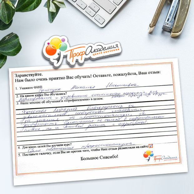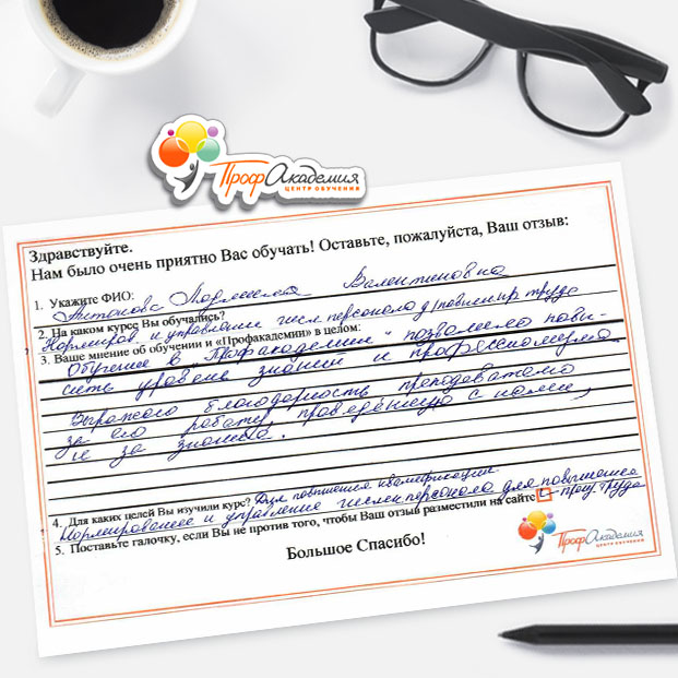 Обучение в "Профакадемии" позволило повысить уровень знаний и профессионализма. Выражаю благодарность преподавателю за его работу, проведенную с нами, и за знания.