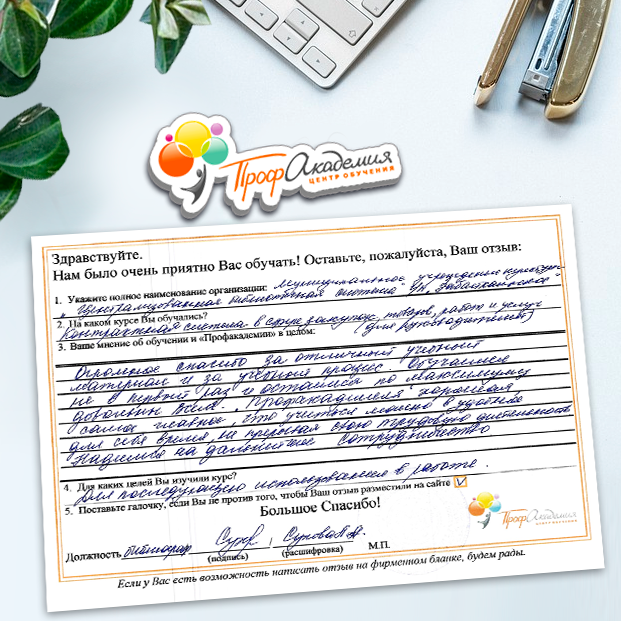 Огромное спасибо за отличный учебный материал и за учебный процесс. Обучаемся не в первый раз и остаемся по максимуму довольны всем. "Профакадемия" хорошая, самое главное, что учиться можно в удобное для себя время, не прерывая свою трудовую деятельность. Надеемся на дальнейшее сотрудничество.